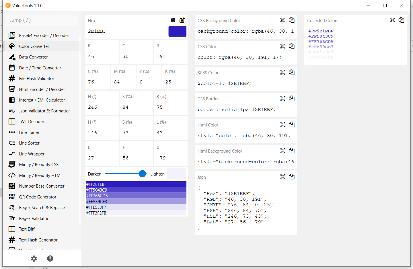 Get Base64 Converter, Color Converter and Palette Creator, Regex Validator, Regex Search and Replace, Json Lint and other powerful tools, that all work offline in a single app.